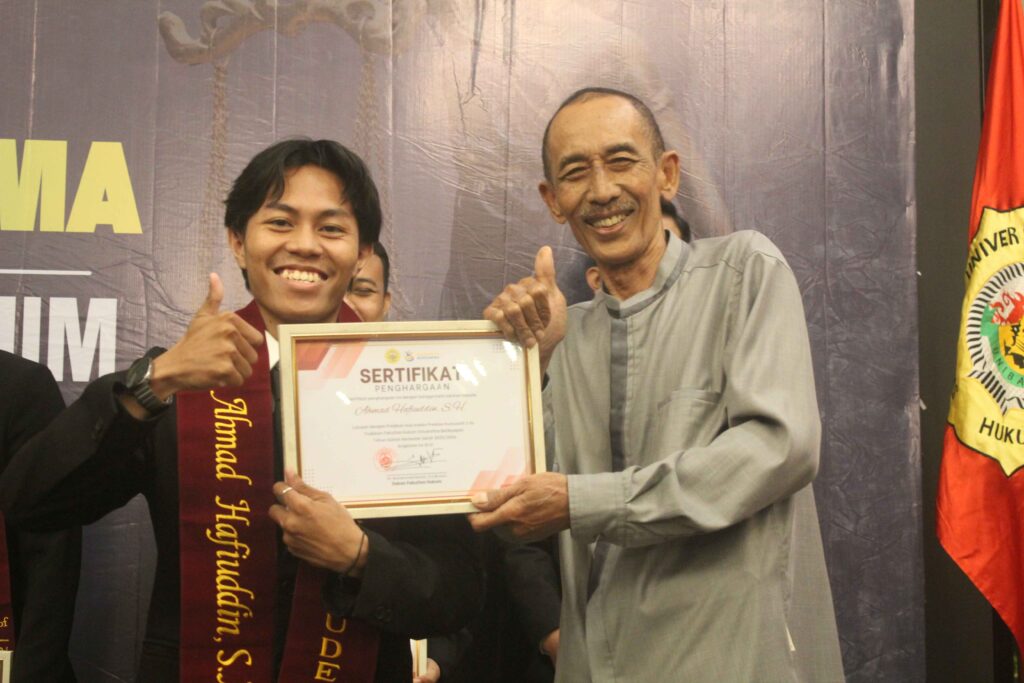 BALIKPAPAN—Momen Yudisium Fakultas Hukum Universitas Balikpapan Semester Ganjil Tahun Akademik 2025/2026 LXVI menjadi kenangan tak terlupakan bagi Ahmad Hafiuddin. Sebab, ia dinobatkan sebagai peraih Indeks Prestasi Kumulatif (IPK) tertinggi dari 57 peserta yudisium, yang digelar di Balayan Room, Hotel Gran Senyiur, Sabtu (28/02/2026).